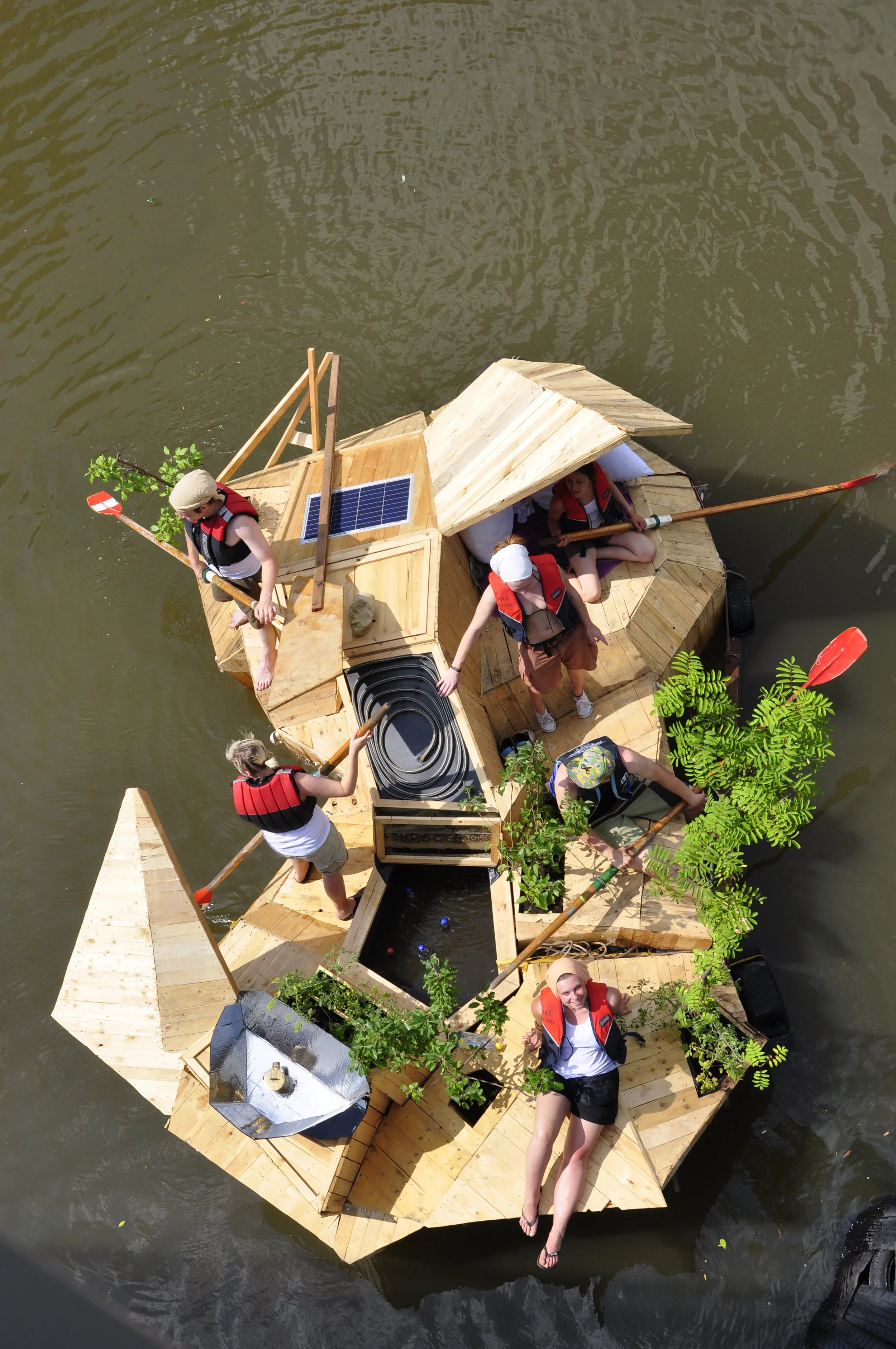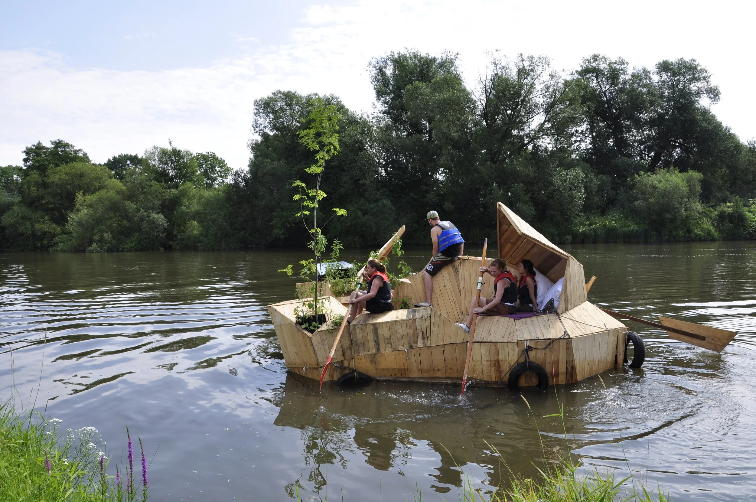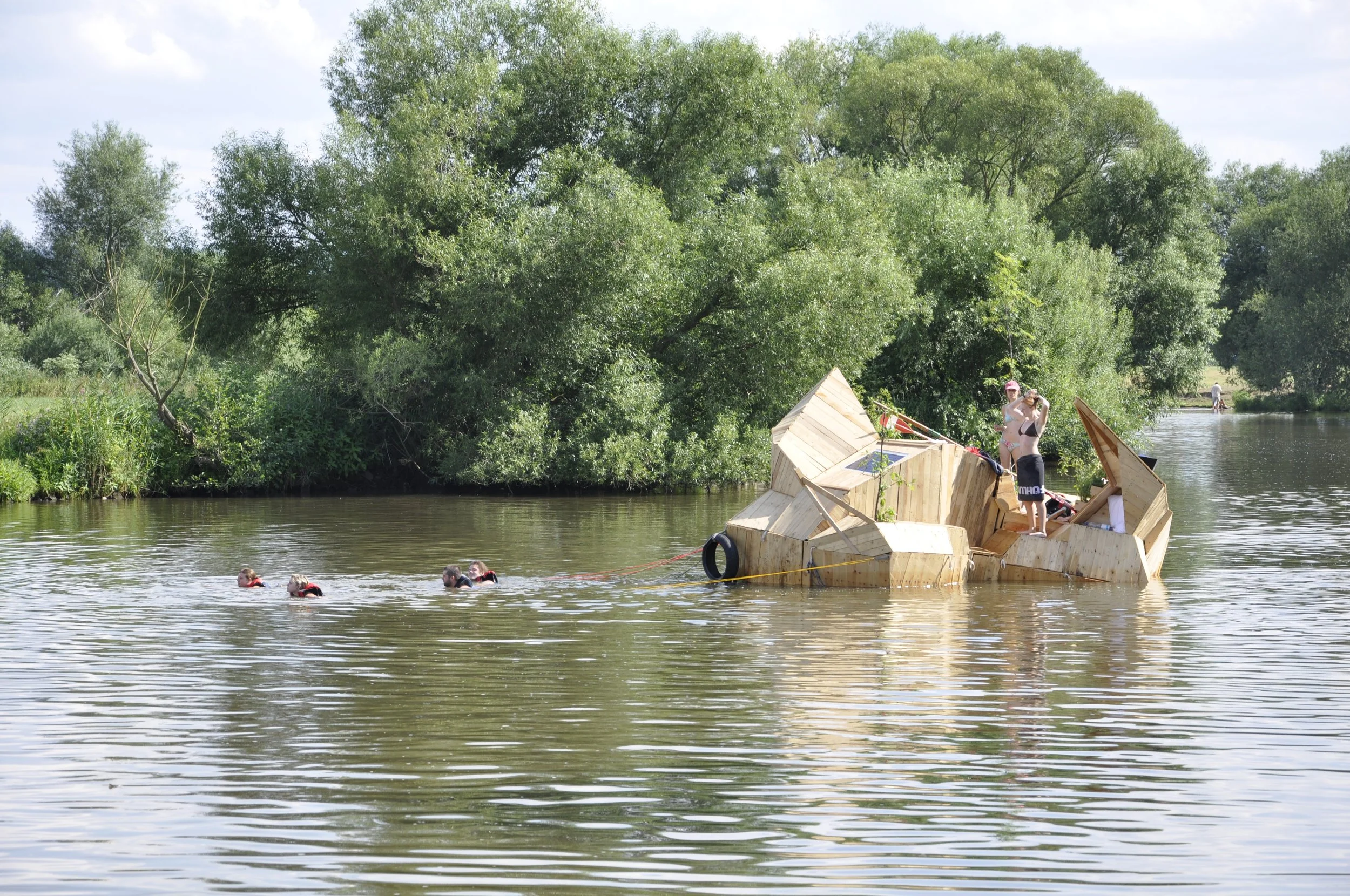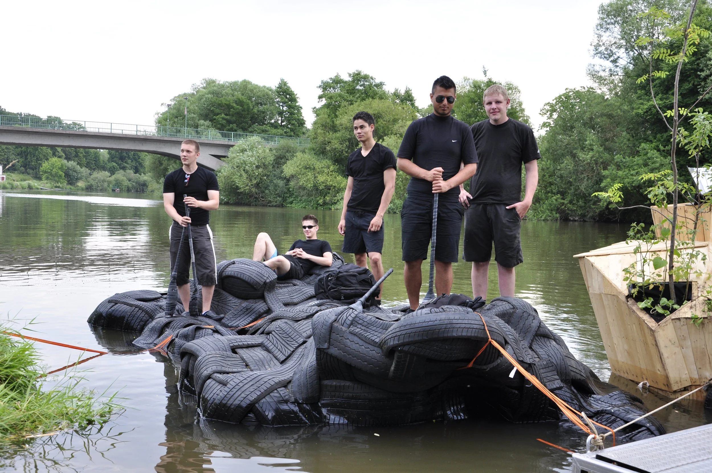 NACH EINEM SEMESTER INTENSIVER GRUPPENARBEIT von der Konzeption, über den Entwurf, die Materialbeschaffung und die Konstruktion IN DER EXPERIMENTALBAUWERKSTATT DES FACHGEBIETES, WURDEN DIE FLÖSSE Während der Rundgangswoche ERFOLGREICH zu wasser gelassen. ALLE schafften DIE FLUSSFAHRT INKLUSIVE SCHLEUSENGANG UND ZWISCHENSTOPP BIS ZUM ANLANDEN MIT ÜBERNACHTUNG auf gut Kragenhof.
